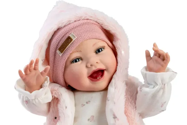 Pintada a mano, con detalles como textura de la piel, rojeces, uñas, venas. Su cuerpo es de tela y extremidades de goma de vinilo. Mide 42 cm. No tiene pelo. Su peso es de 2,200 kg aprox. Va vestida con una camiseta de manga larga beige con pequeños dibujos infantiles d color rosa. braguita rosa y chaleco con capucha de pelo rosa con estrellitas brillantes Además, lleva incluido su pañal, zapatillas rosas y biberón.
